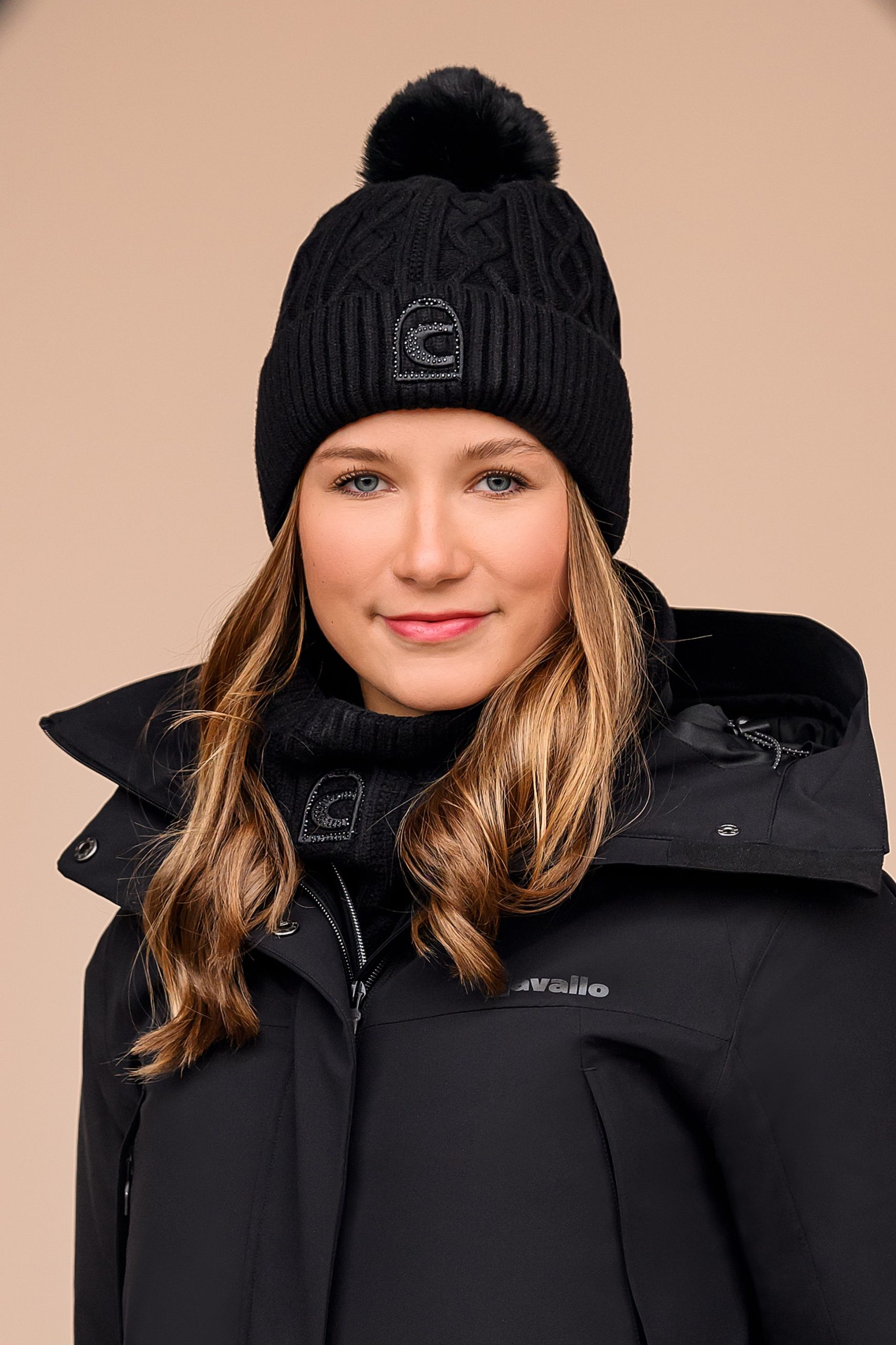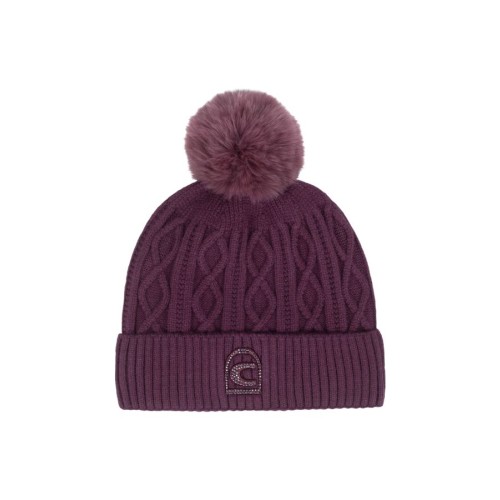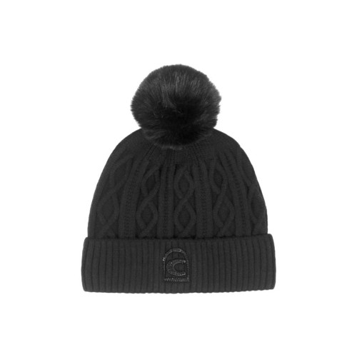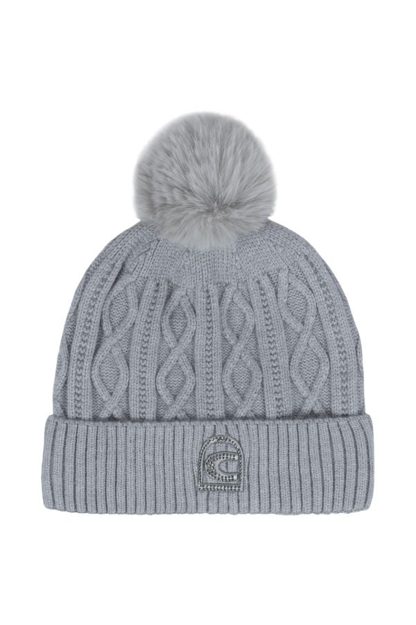 This elegant knitted hat features an intricate cable pattern and a tonal faux fur bobble for a stylish touch. The faux fur bobble is detachable, allowing for versatile styling options. The brim is adorned with Cavallo 3D embroidery, enhanced by tonal crystal stones for a refined, luxurious finish. The hat is lined with soft fleece on the inside, providing extra warmth and comfort, making it perfect for colder weather. Combining sophistication and practicality, this hat is an ideal accessory for adding a touch of elegance to any winter outfit.