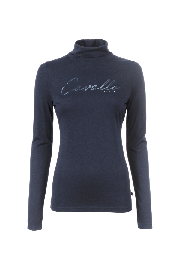 This thin turtleneck shirt is crafted from soft, high-quality functional material with an active wool content, providing warmth, breathability, and comfort. Designed for all-day wear, it is odorless and non-scratching, ensuring a pleasant feel against the skin. The elegant design features tonal Cavallo artwork in the center of the chest, embellished with subtle tonal crystal stones for a refined look. Adding to its sophisticated details, a tonal Cavallo stirrup with crystal stones adorns the left sleeve hem. Perfect for layering or wearing on its own, this stylish and functional turtleneck is ideal for equestrian activities and everyday fashion.