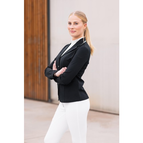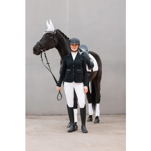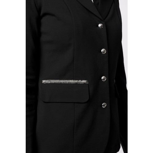 Indulge in elegance with our Nova Women’s Show Jacket, crafted from light summer fabric for breathability and stretch. Adorned with glitter tape on pockets and collar, it features 2 front flap pockets that can be tucked in for a polished, versatile look.