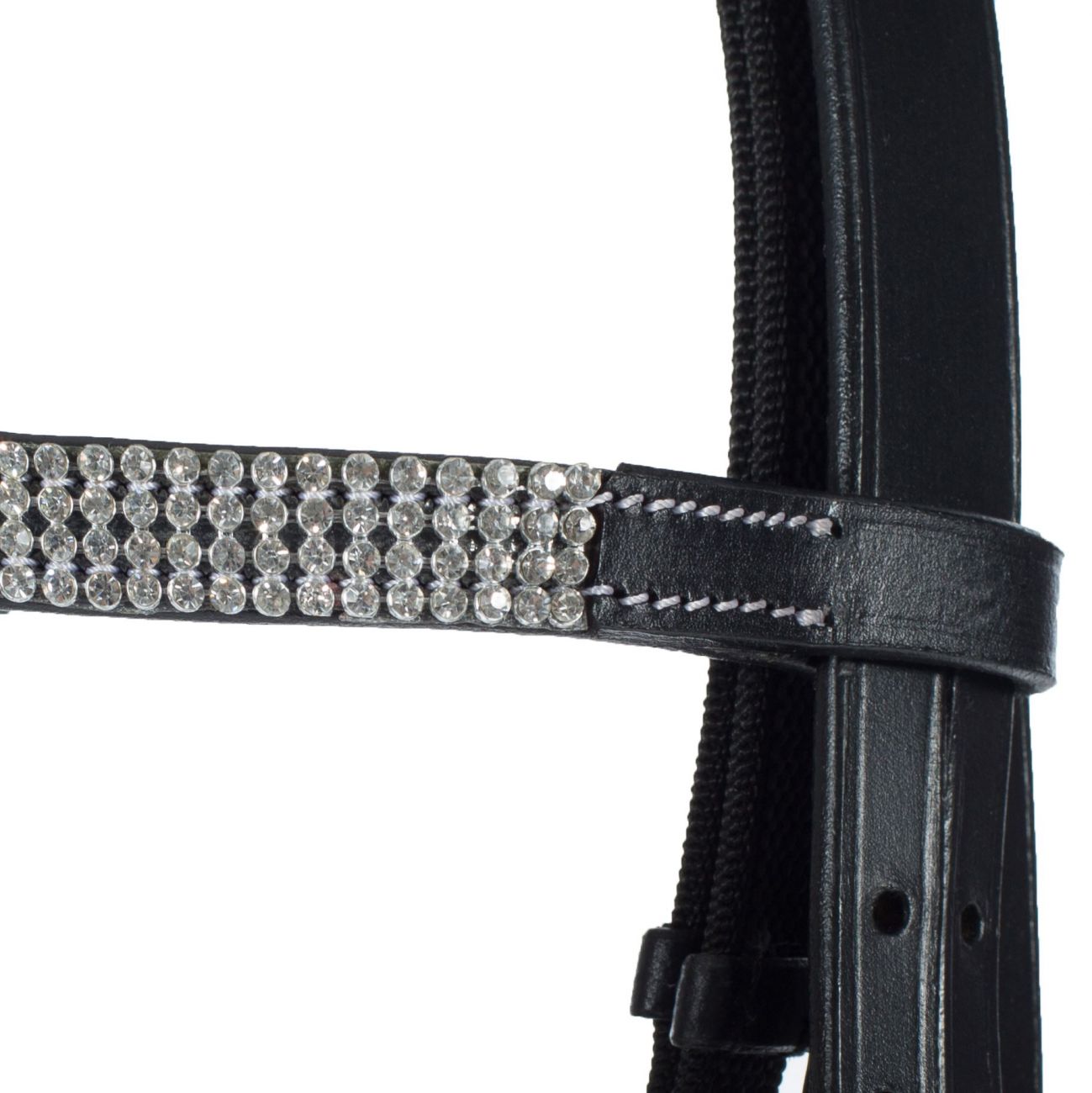 Add some sparkle and shine to the pony in your barn with this quality leather bridle. Three sparkling rows of crystals add to the charm of this value-priced bridle. The thin noseband has a flash option and the bow-shaped browband adds a bit of bling to this pony-size bridle.
