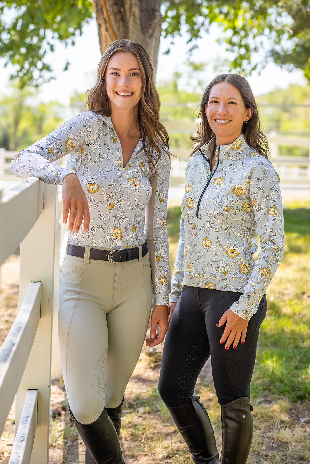 This season’s leafy Jacobean print features beautiful neutrals including dove gray, black, cream and gold. Worn back with your favorite breech, Kastel skort, golf pant or contemporary denim, we have you covered. Long sleeves, breathable power mesh, 1/4 zip, UPF 30 and soft 4-way stretch fabric in a contemporary fit.