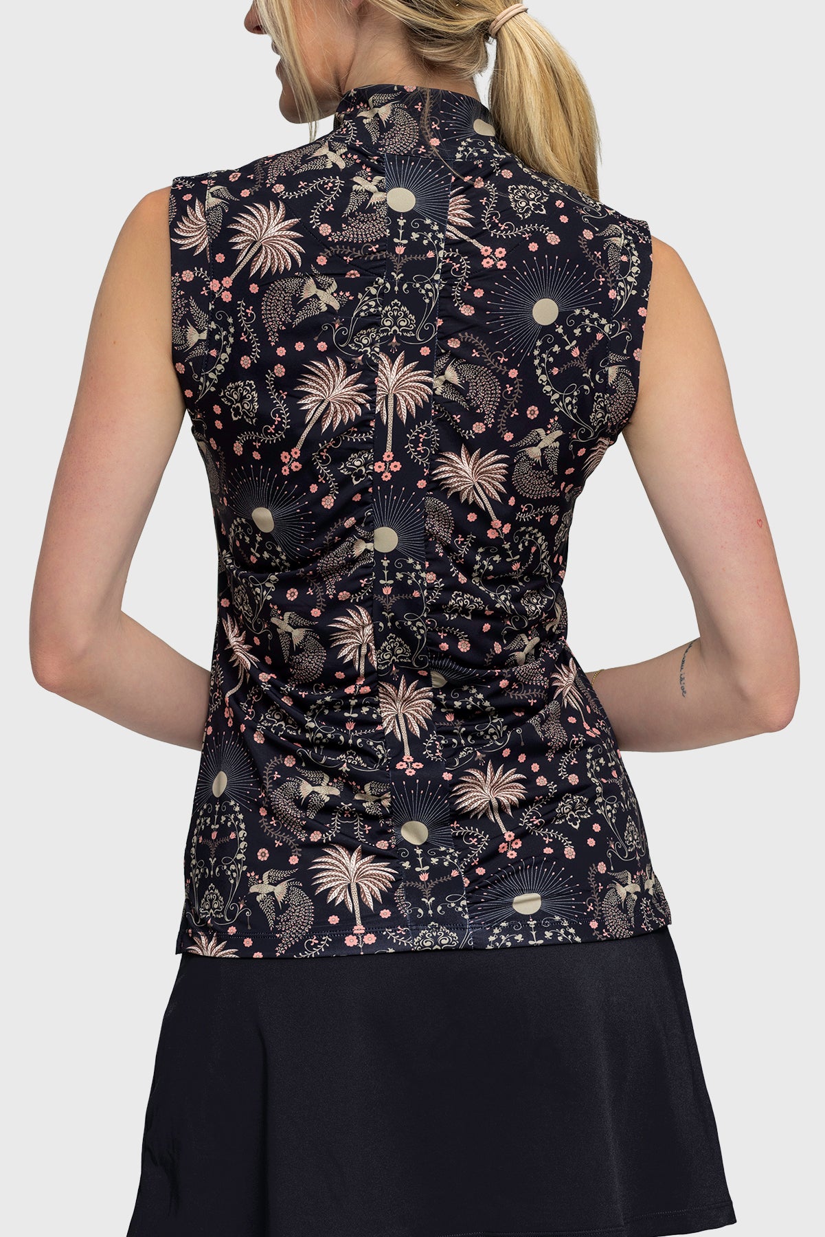 Kastel Sleeveless Ruched Back Black Regal Palm Shirt
