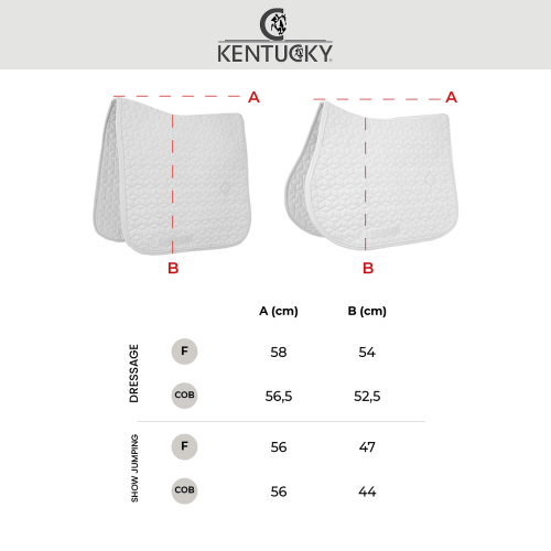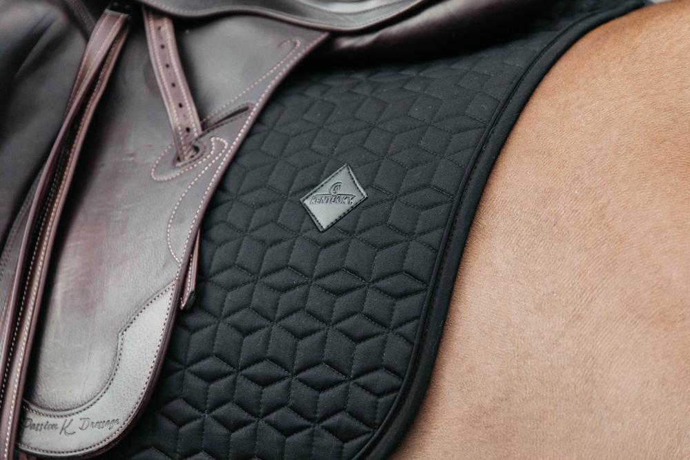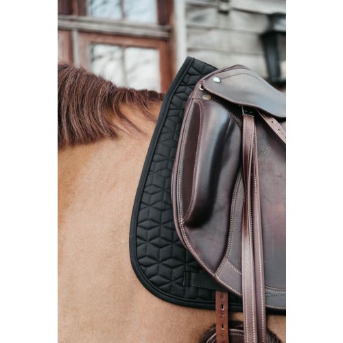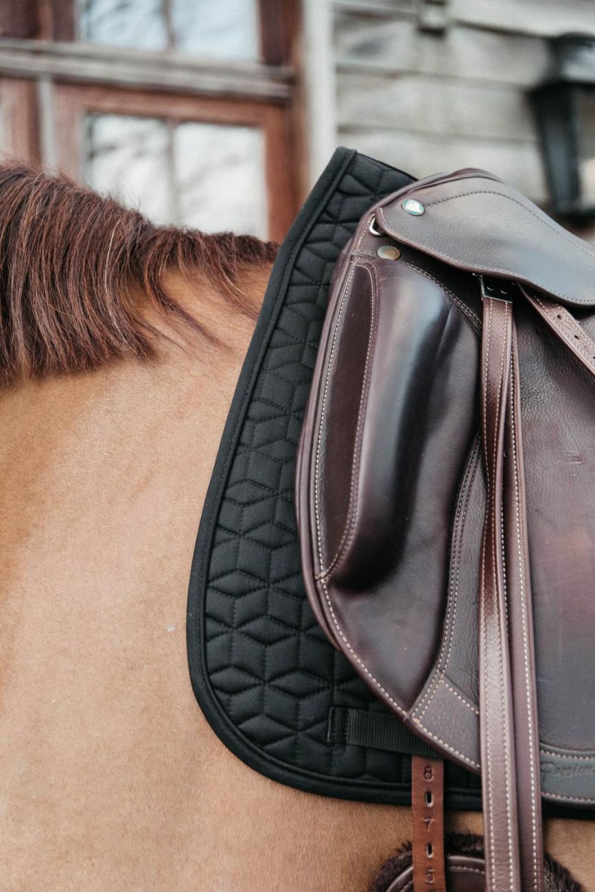 The outside of the saddle pad is made from a cotton-like polyester in a chic cube quilting design. On the left side of the saddle pad is a small vegan leather patch with the Kentucky logo, under the logo there’s enough space for embroidery. The lining of the saddle pad is a moisture-wicking cotton-polyester mix.