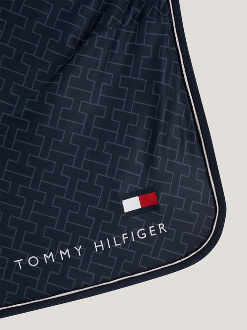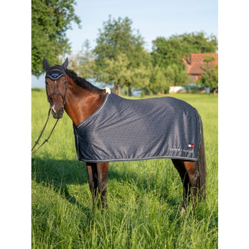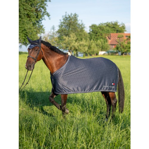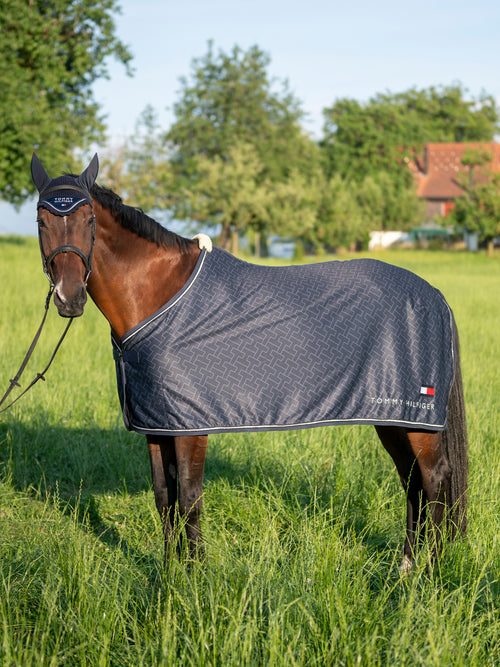 The Windsor Light & Dry Monogram rug is the perfect addition to your horse’s wardrobe for training days away or travelling to a show. Sporting a shimmering fabric finish, shine cord detailing, TH Monogram pattern and a large classic lurex embroidered ‘Tommy Hilfiger’ and Flag. Faux fur at the wither adds comfort whilst the front closure provide a secure and stable fit. Separate optional elastic strap with asjustable slider provides security to stablize rug.